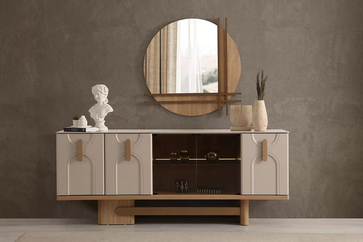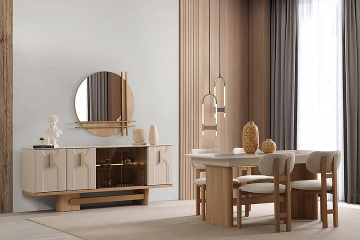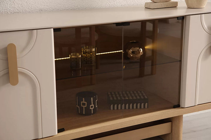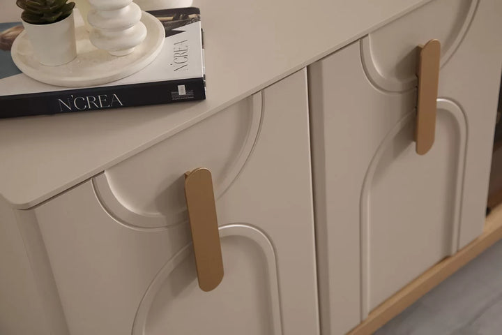 Comodă de dining modernă, ce denotă o eleganță aparte, este realizată din MDF vopsit culoare cașmir, având detalii fine aurii și o bandă LED integrată. Designul său contemporan adaugă un plus de rafinament și stil oricărei încăperi, oferind nu doar funcționalitate, dar și o atmosferă sofisticată și luminoasă.