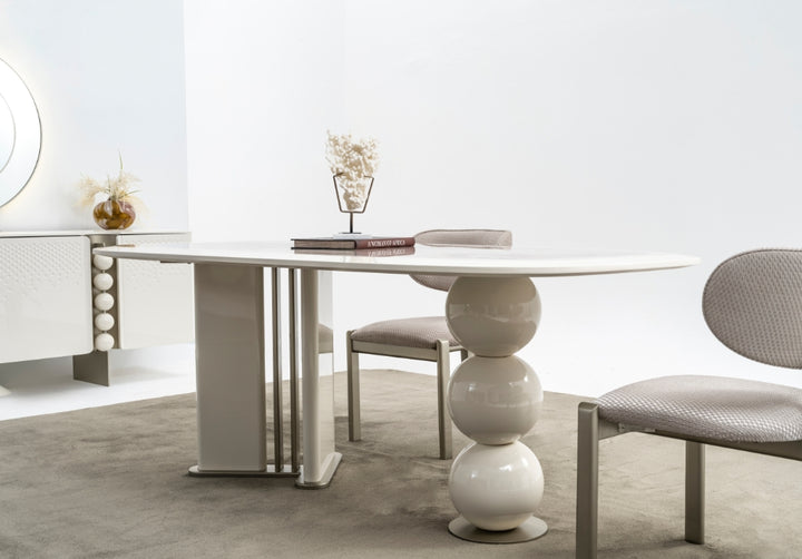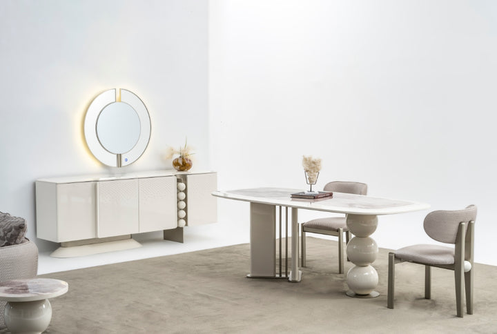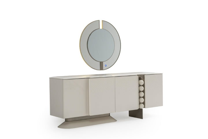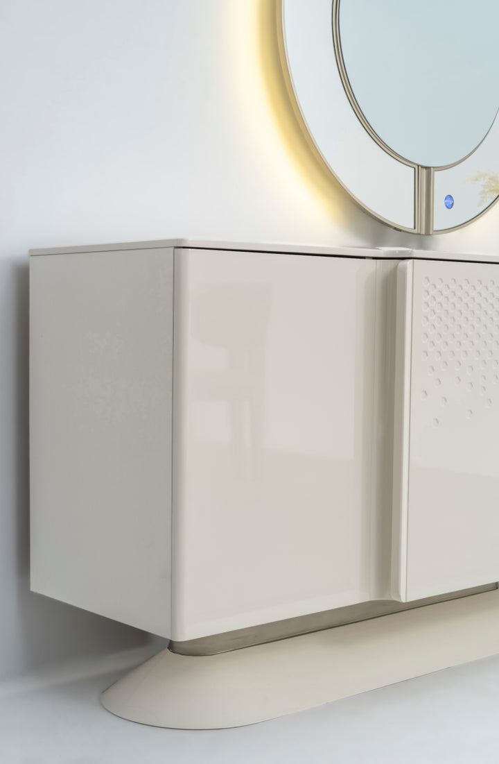 Comodă dining realizată din mdf vopsit lucios , picioare auriu sidefat și oglindă cu bandă led. Liniile ușor rotunjite și detaliile perlate denotă eleganță și rafinament în casa dumneavoastră.