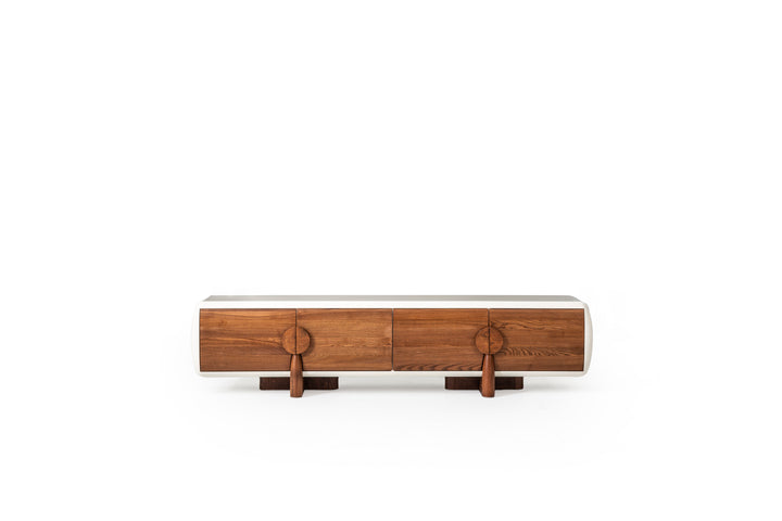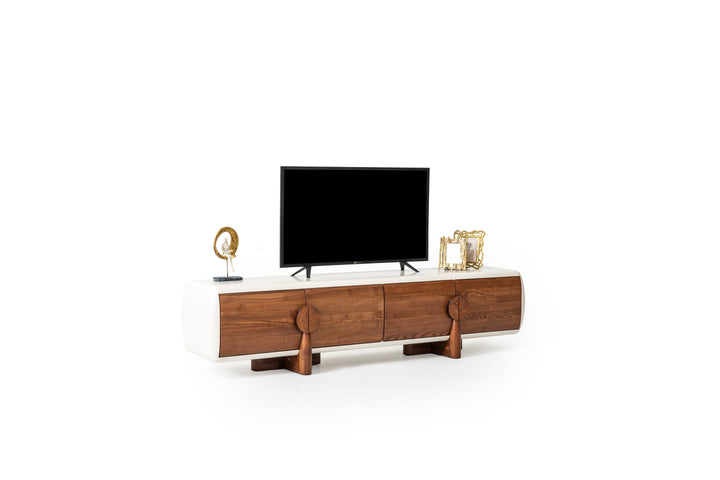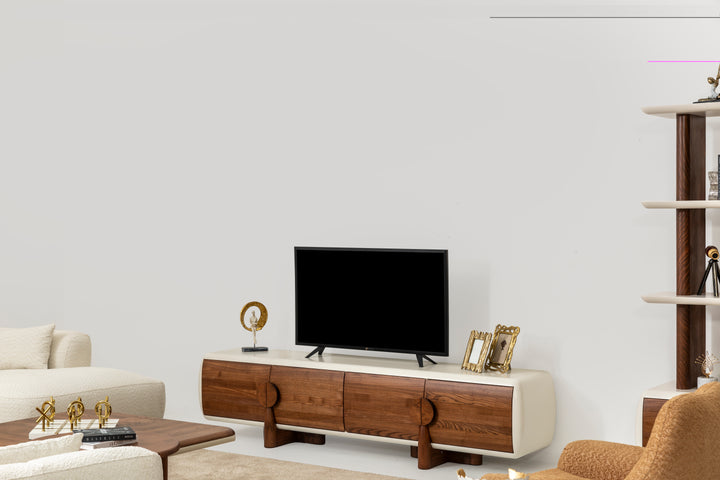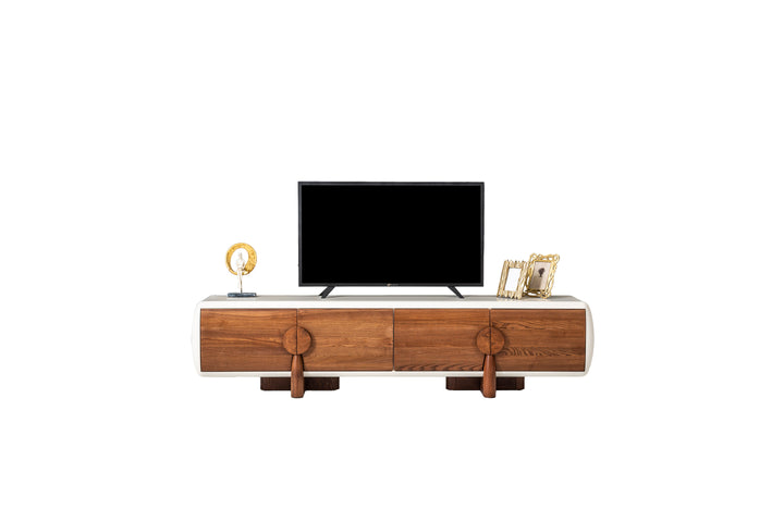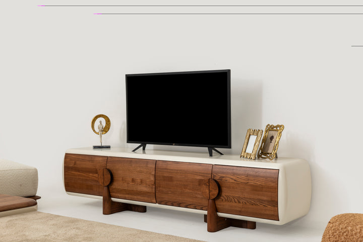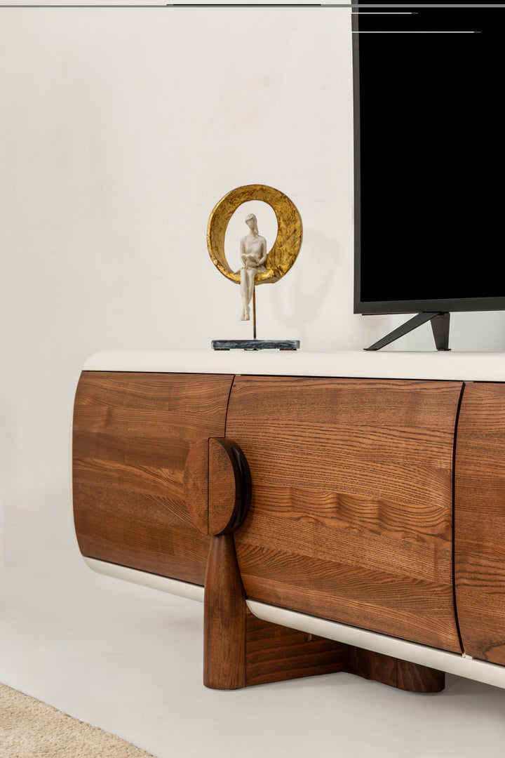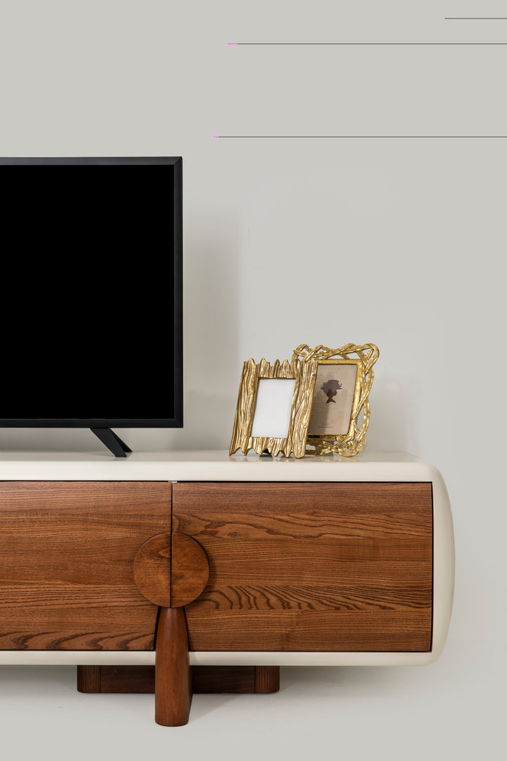 Comodă TV realizată dintr-o combinație de lemn masiv și MDF, cu linii rotunjite ce poate fi ușor încadrată în orice living, fie el modern sau clasic accentuând atât confortul cât și funcționalitatea.