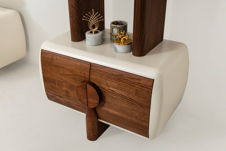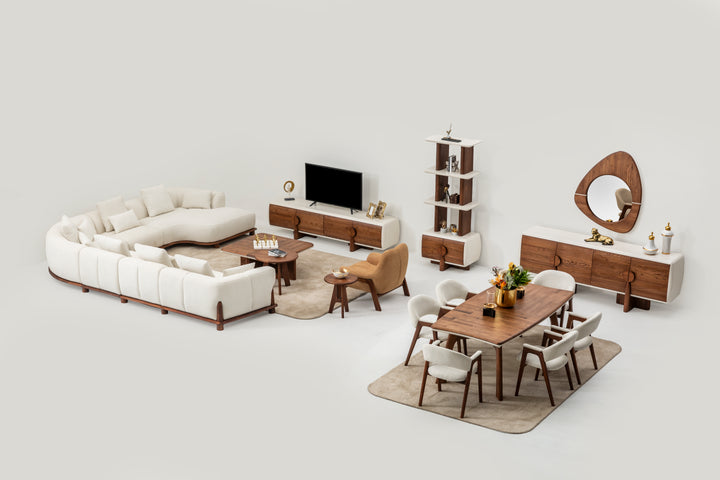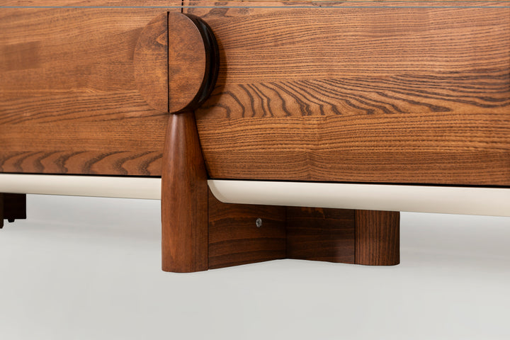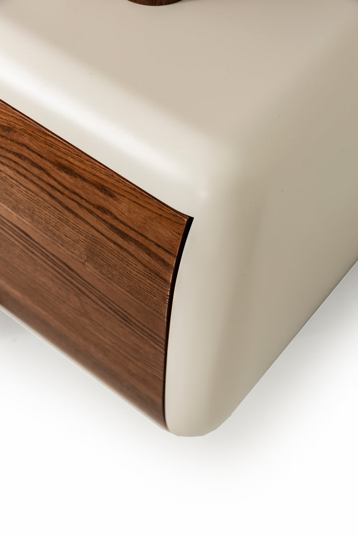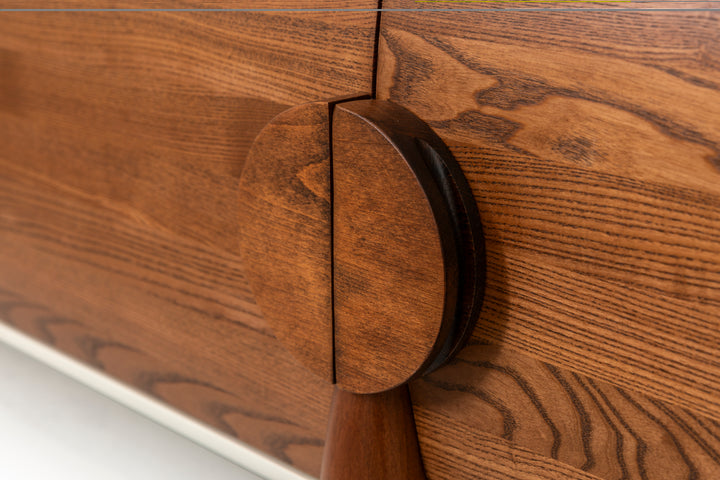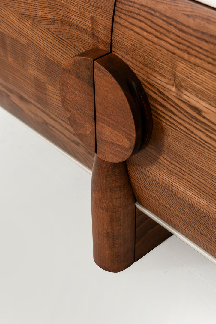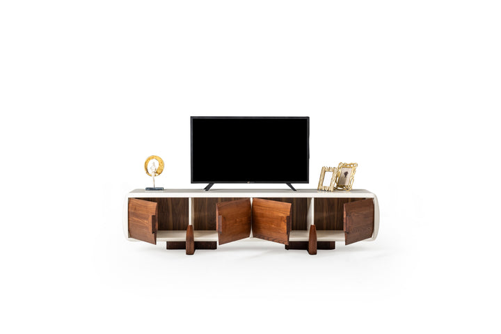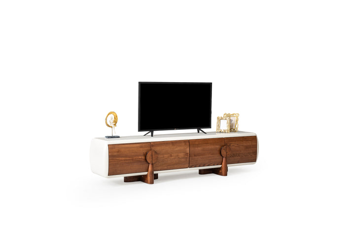 Comodă TV realizată dintr-o combinație de lemn masiv și MDF, cu linii rotunjite ce poate fi ușor încadrată în orice living, fie el modern sau clasic accentuând atât confortul cât și funcționalitatea.