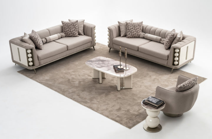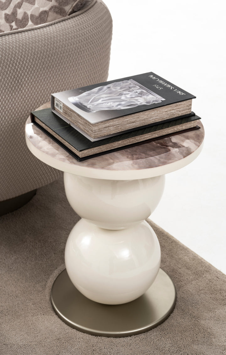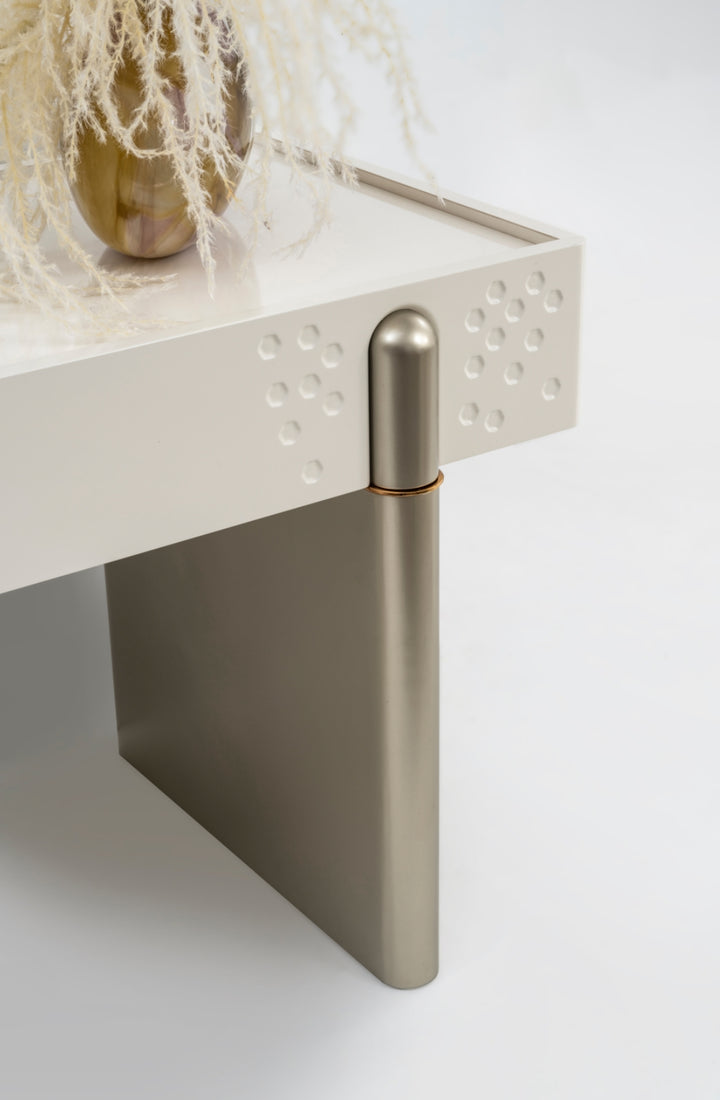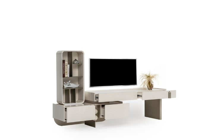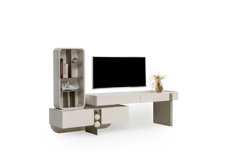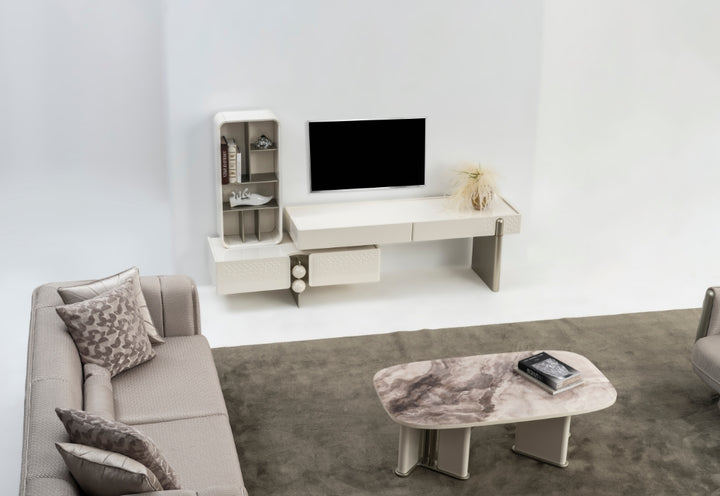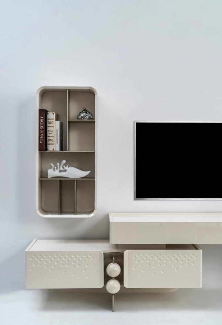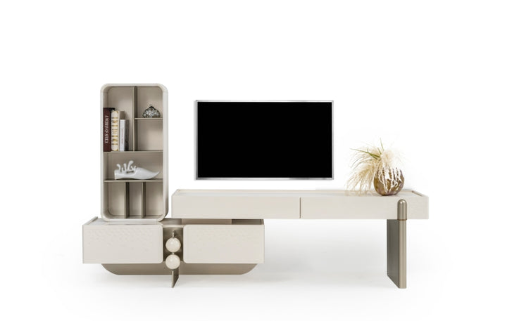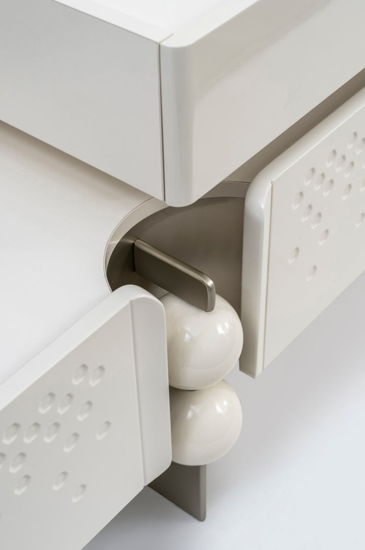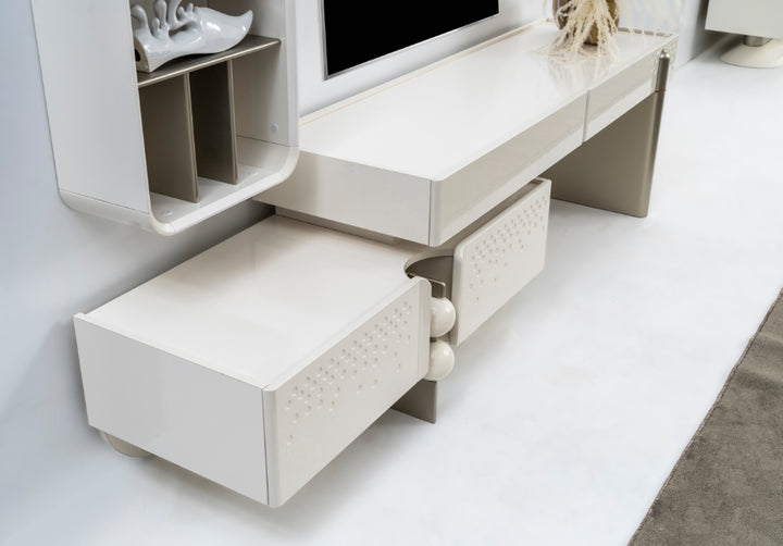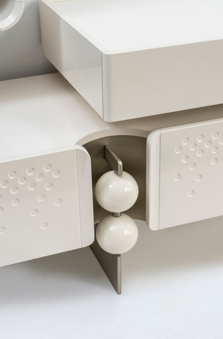 Comodă TV realizată din mdf vopsit lucios și picioare auriu sidefat. Liniile ușor rotunjite și detaliile perlate denotă eleganță și rafinament.