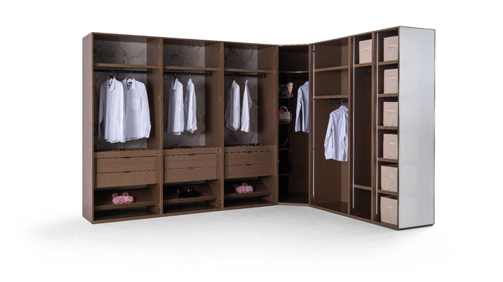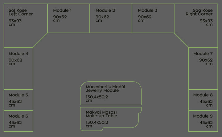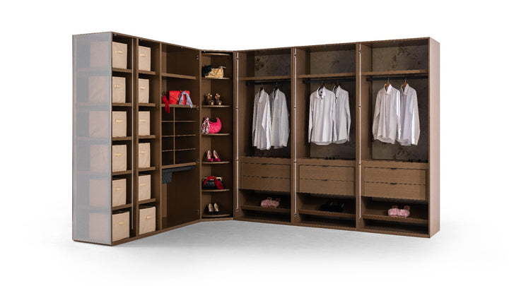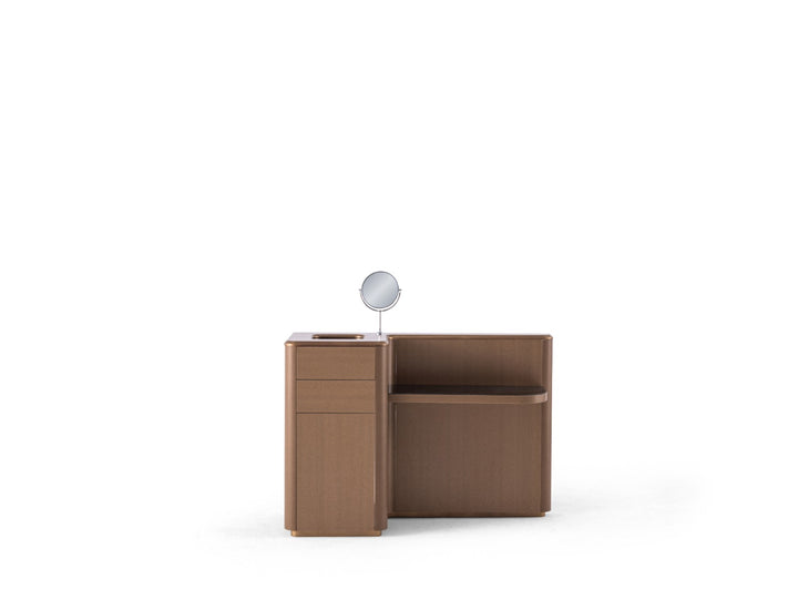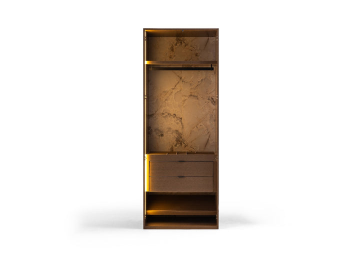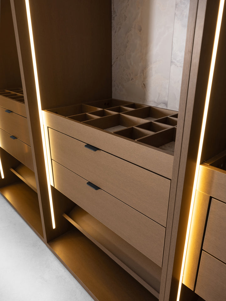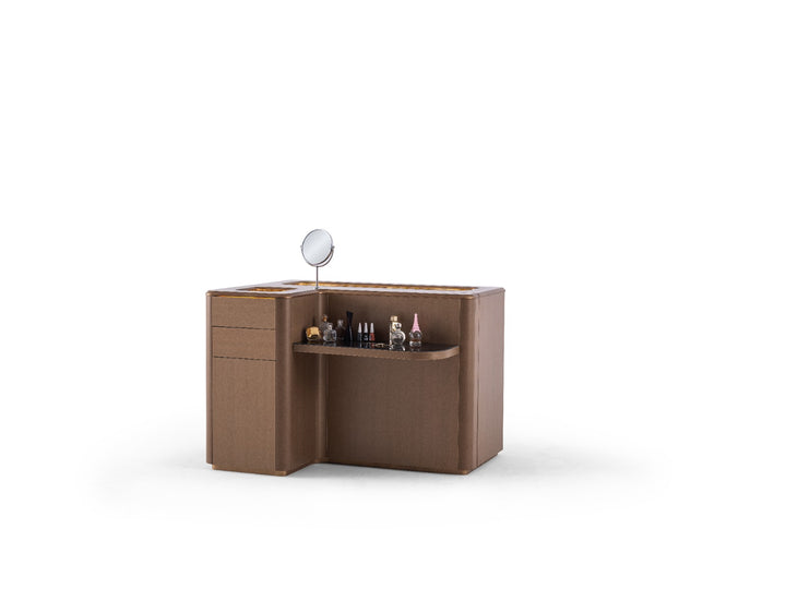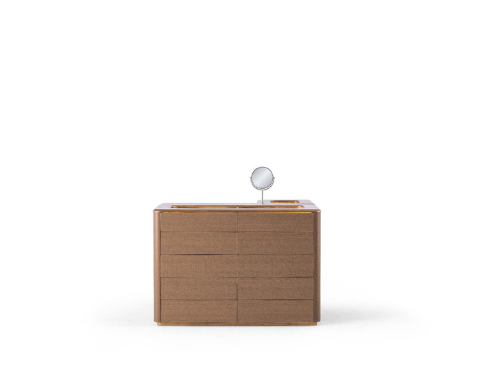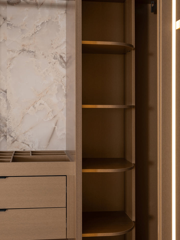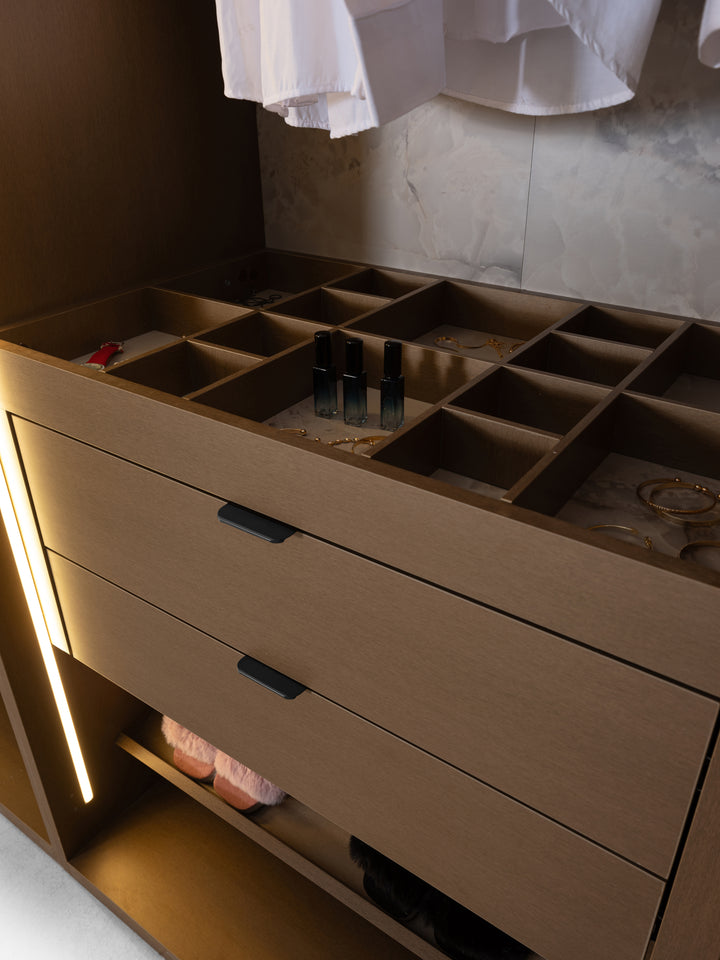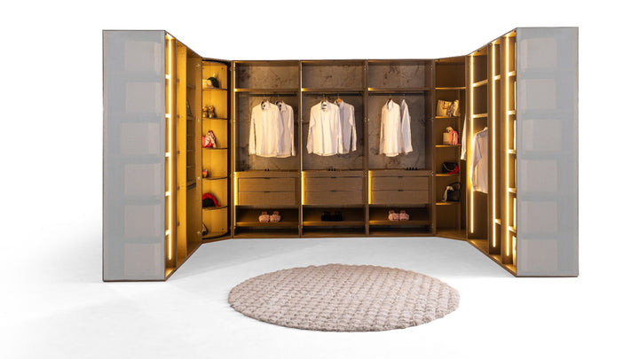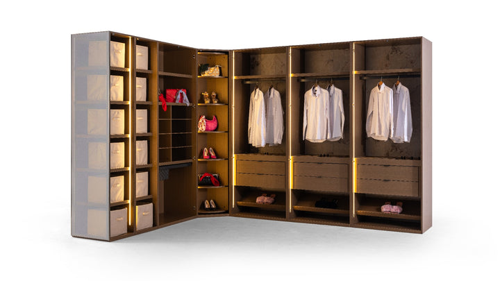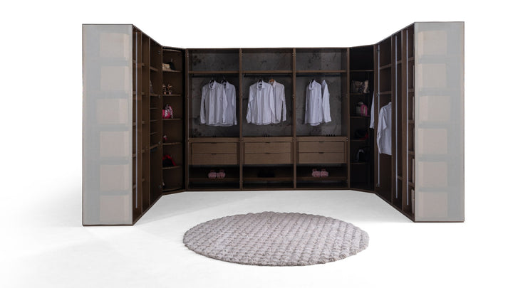 Dressing modular MOCHA are un design modern și opțiuni de uși din sticlă bronze, cu detalii aurii-satinate, cu sistem de iluminare LED încastrată în laterală. Poate fi personalizat în variantele de 45 cm, 90 cm și colț cu volum mare. Laturile sunt prelucrate CNC . Iluminarea LED este cu senzor de mișcare.