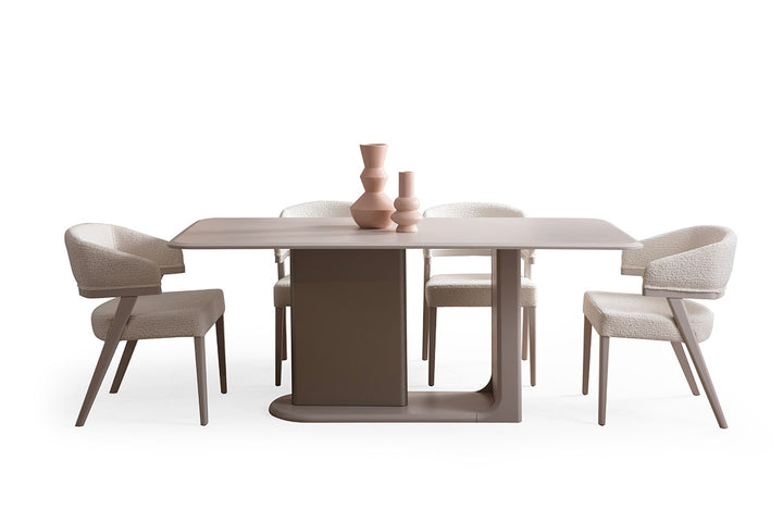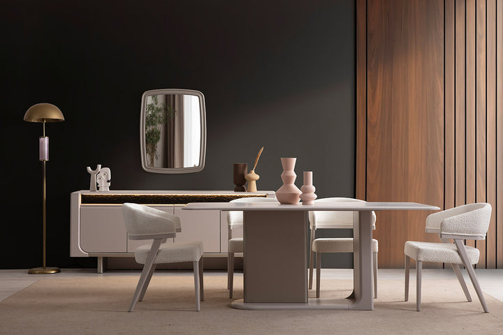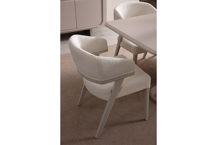 Mobilierul este realizat din MDF vopsit de înaltă calitate, oferind atât durabilitate, cât și un aspect rafinat. Scaunele din această colecție sunt personalizabile, putând fi comandate pe orice stofă disponibilă în paletarul de culori. Astfel, poți alege finisajul perfect pentru a se potrivi stilului tău și designului încăperii.